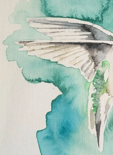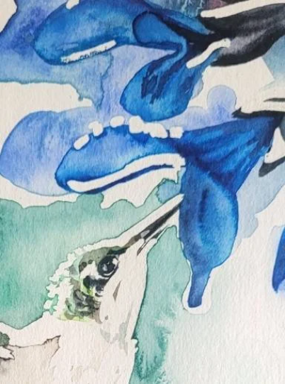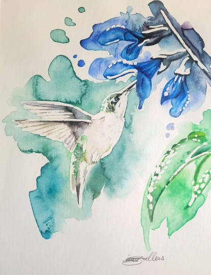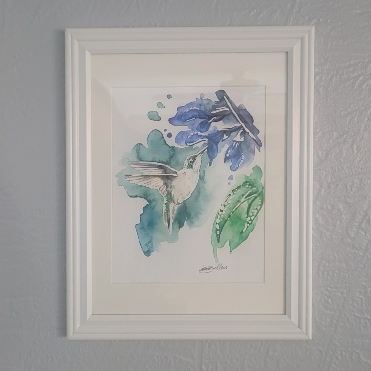 Handmade original. One of a kind watercolor featuring a single hummingbird and wisteria flowers.